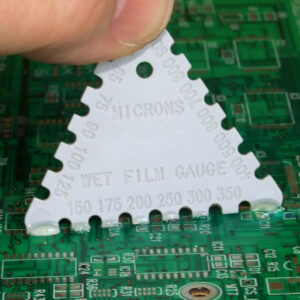 - Thước đo độ dày lớp phủ ướt (Wet film thickness gauge): Độ dày phủ có thể đo trực tiếp bằng cách sử dụng loại thước đo phù hợp, có chứa các rãnh và răng cưa với độ dài đã được hiệu chuẩn. Thước này được đặt trực tiếp lên lớp tẩm phủ khi ướt trên bề mặt bo mạch để đo độ dày, sau đó kết quả đo được nhân với tỷ lệ phần trăm chất rắn có trong lớp phủ để tính toán độ dày lớp phủ khô xấp xỉ.